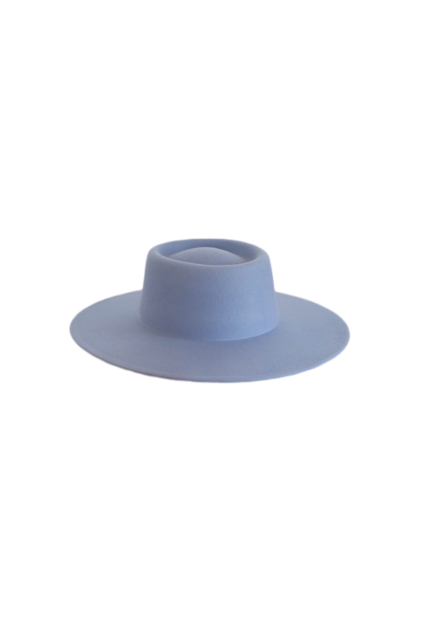 Our unisex, flat-crowned Bolero hat boasts a telescope crown and stiff wide 8cm brim in 100% wool. This sky blue beauty is an all-season hat for dancing on late summer nights or camping out on chilly Autumn weekends.