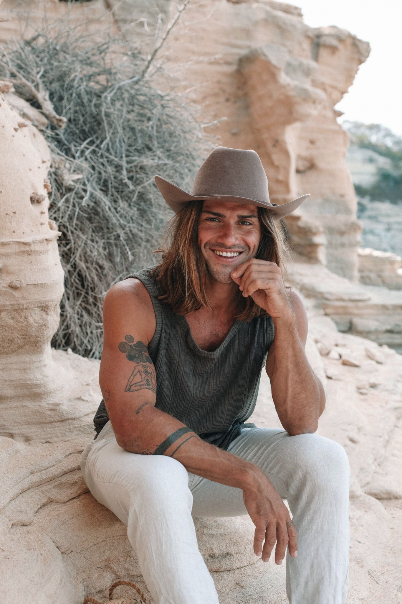 Our classic cowboy hat in earth-toned 100% wool. The stiff brim is 8cm wide and cuts an unmistakeable silhouette on the mountain skyline. It´s this season´s must-have for music festivals, lunch dates and lazy Sunday hang-outs... you don´t need to be a cattleman to rock our Vaquero!